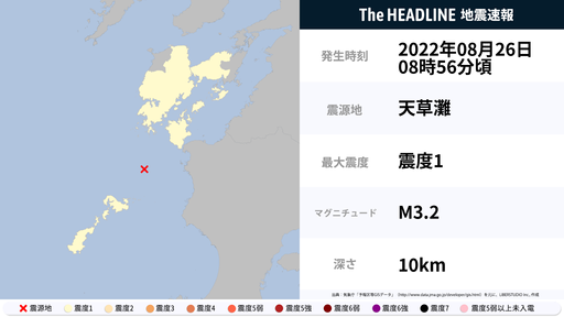 8月26日8時56分頃、熊本県・鹿児島県で最大震度1の地震を観測