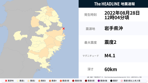 8月28日12時4分頃、青森県・岩手県で最大震度2の地震を観測