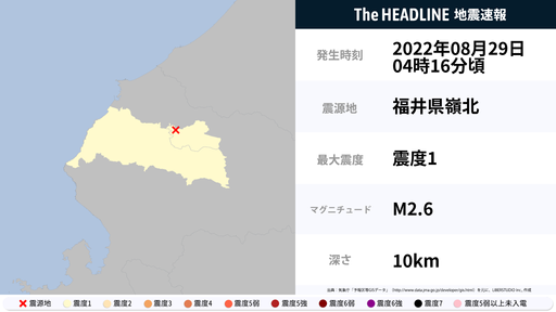 8月29日4時16分頃、福井県で最大震度1の地震を観測