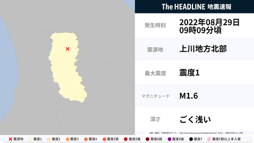 8月29日9時9分頃、北海道で最大震度1の地震を観測
