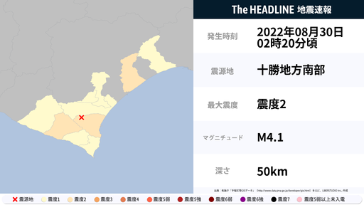 8月30日2時21分頃、北海道で最大震度2の地震を観測
