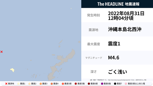 8月31日12時5分頃、沖縄県で最大震度1の地震を観測