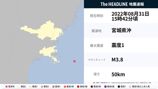 8月31日15時43分頃、岩手県・宮城県で最大震度1の地震を観測