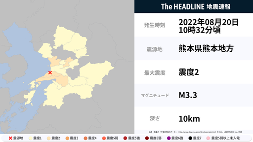 8月20日10時32分頃、熊本県で最大震度2の地震を観測