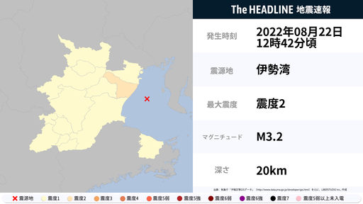 8月22日12時42分頃、三重県で最大震度2の地震を観測