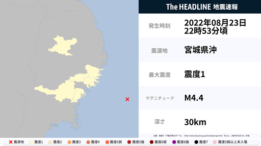 8月23日22時53分頃、岩手県・宮城県で最大震度1の地震を観測