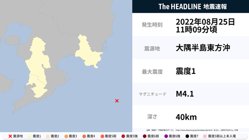 8月25日11時9分頃、宮崎県・鹿児島県で最大震度1の地震を観測