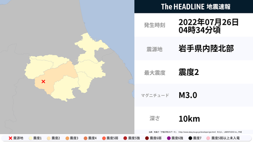 7月26日04時34分頃、岩手県で最大震度2を観測する地震がありました。