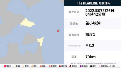 7月26日04時43分頃、北海道などで最大震度1を観測する地震がありました。