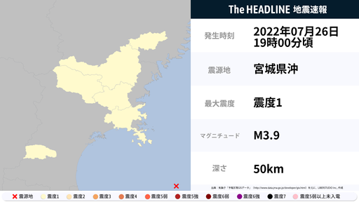 7月26日02時57分頃、宮崎県で最大震度1を観測する地震がありました。