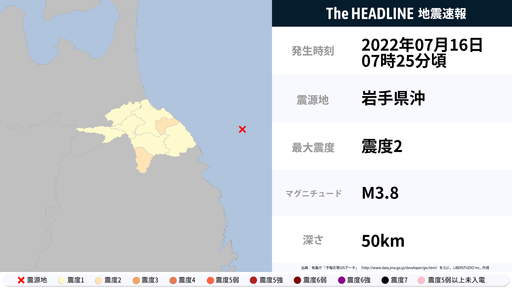 7月16日07時25分頃、青森県などで最大震度2を観測する地震がありました。