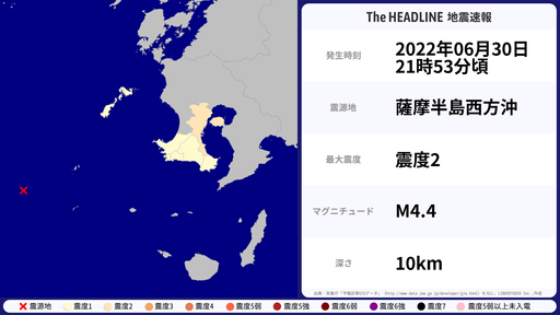 6月30日21時53分頃、鹿児島県で最大震度2を観測する地震がありました。