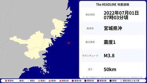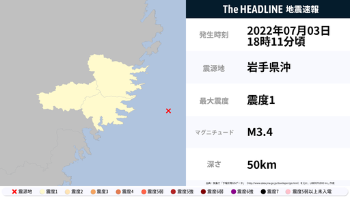 7月3日18時11分頃、岩手県で最大震度1を観測する地震がありました。