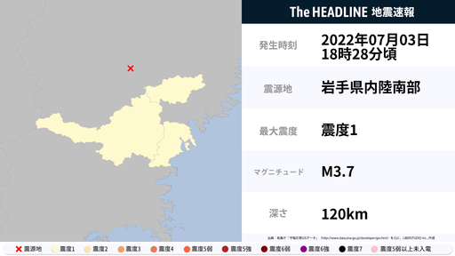 7月3日18時28分頃、岩手県などで最大震度1を観測する地震がありました。