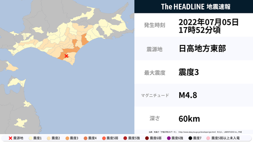 7月5日17時52分頃、北海道で最大震度3を観測する地震がありました。