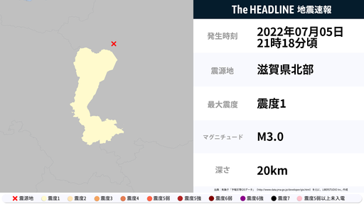 7月5日21時18分頃、滋賀県で最大震度1を観測する地震がありました。
