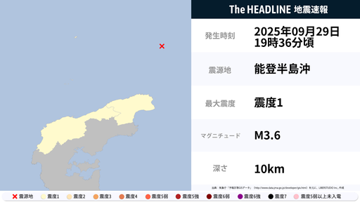 9月29日19時36分頃、石川県で最大震度1の地震を観測