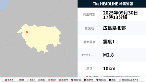 9月30日17時13分頃、広島県で最大震度1の地震を観測