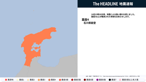 12月14日23時26分頃、石川県で震度3以上の地震を観測