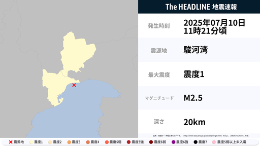 7月10日11時21分頃、静岡県で最大震度1の地震を観測
