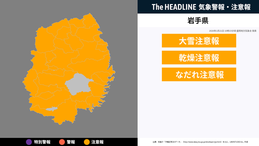 1月21日10時15分頃、岩手県の大雪注意報・乾燥注意報などが更新