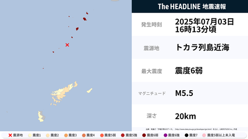 7月3日16時13分頃、鹿児島県で最大震度6弱の地震を観測