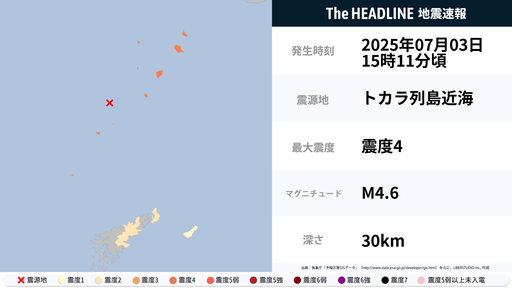 7月3日15時11分頃、鹿児島県で最大震度4の地震を観測