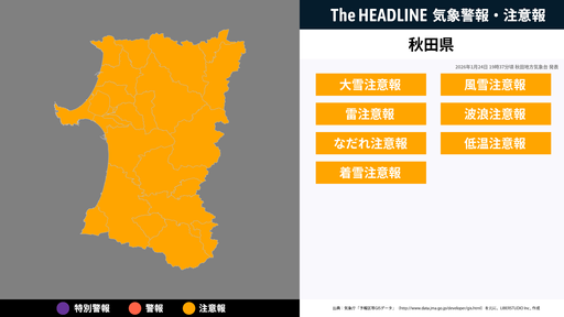 1月24日19時37分頃、秋田県の大雪注意報・風雪注意報などが更新