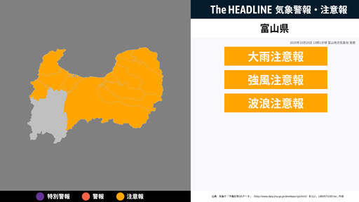 10月20日13時1分頃、富山県に大雨注意報・強風注意報などが発表
