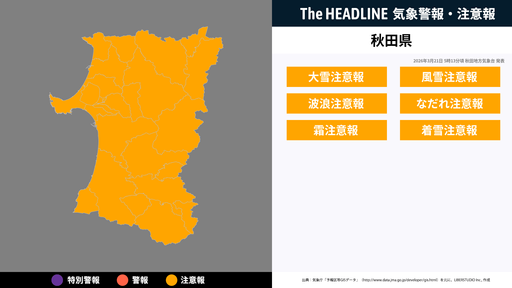 1月25日5時30分、秋田地方気象台は、秋田県に発表されている警報・注意報の経過、予測、防災上の留意点などを解説するために発表していた気象情報を更新した。
