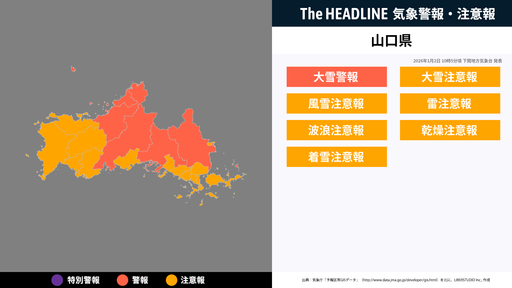 2月24日16時14分、下関地方気象台は、山口県に発表されている警報・注意報の経過、予測、防災上の留意点などを解説するために発表していた気象情報を更新した。