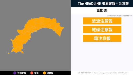 3月19日6時30分、高知地方気象台は、高知県に発表されている警報・注意報の経過、予測、防災上の留意点などを解説するために発表していた気象情報を更新した。