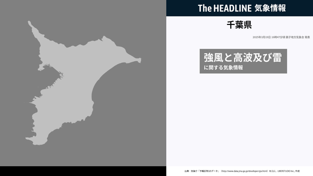 3月19日16時47分、銚子地方気象台は、千葉県に発表されている警報・注意報の経過、予測、防災上の留意点などを解説するために発表していた気象情報を更新した。