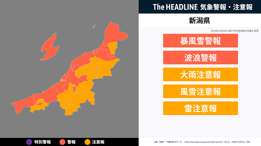 3月26日7時43分、新潟地方気象台は、新潟県に発表されている警報・注意報の経過、予測、防災上の留意点などを解説するために発表していた気象情報を更新した。