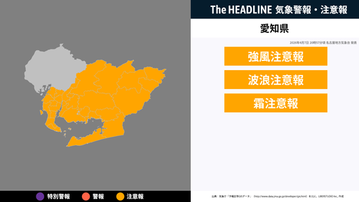 4月6日23時25分、名古屋地方気象台は、警報・注意報に先立ち注意・警戒を呼びかけるため愛知県に発表していた気象情報を更新した。