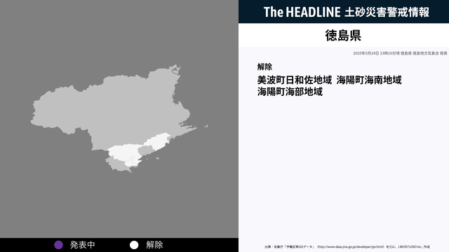 5月24日23時10分、土砂災害の危険性の高まりから徳島県 徳島地方気象台より徳島県に発表されていた、土砂災害警戒情報が解除された。