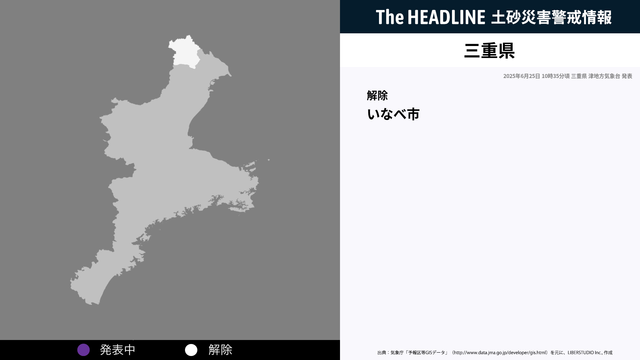 6月25日10時35分、三重県の土砂災害警戒情報が解除された