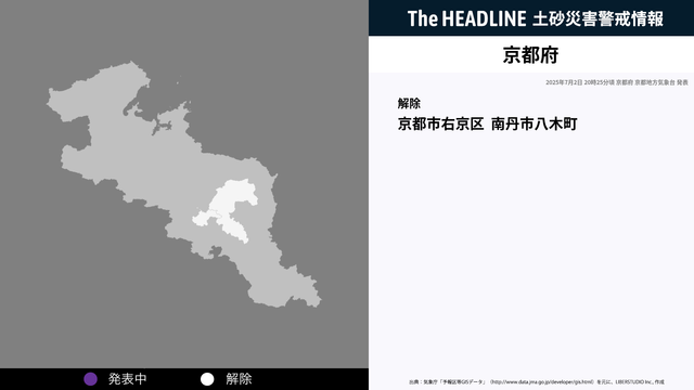 7月2日20時25分、土砂災害の危険性の高まりから京都府 京都地方気象台より京都府に発表されていた、土砂災害警戒情報が解除された。