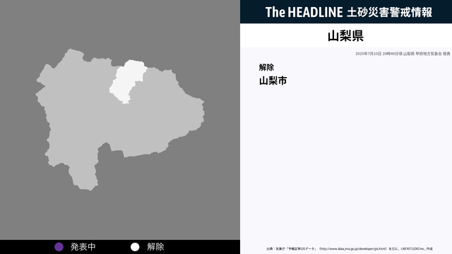 7月10日20時40分、土砂災害の危険性の高まりから山梨県 甲府地方気象台より山梨県に発表されていた、土砂災害警戒情報が解除された。