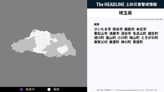 7月10日20時0分、埼玉県の土砂災害警戒情報が解除された