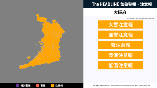 7月13日20時43分、大阪管区気象台は、大阪府に発表されている警報・注意報の経過、予測、防災上の留意点などを解説するために発表していた気象情報を更新した。