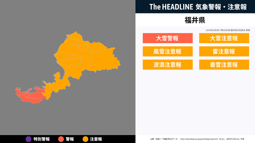 7月25日16時45分、福井地方気象台は、福井県に発表されている警報・注意報の経過、予測、防災上の留意点などを解説するために発表していた気象情報を更新した。