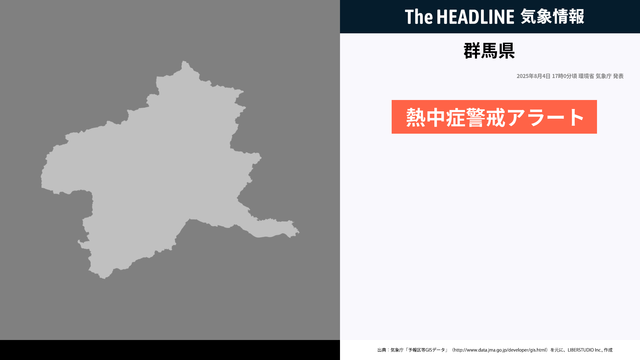 環境省と気象庁は、明日8月5日を対象とした熱中症警報アラートを群馬県に対して発表しました。外出はなるべく避け、室内をエアコン等で涼しい環境にして過ごしてください。