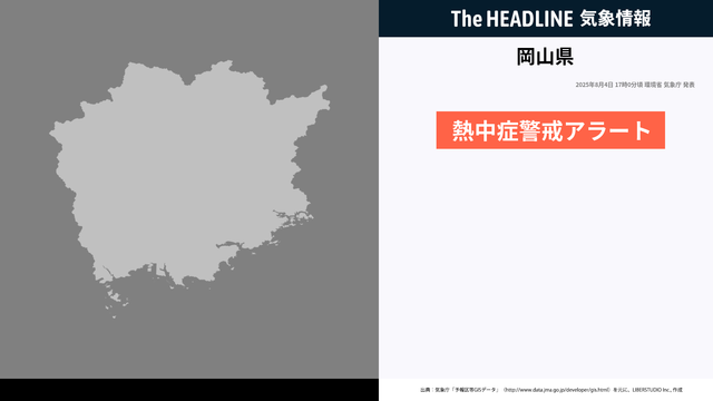 環境省と気象庁は、明日8月5日を対象とした熱中症警報アラートを岡山県に対して発表しました。外出はなるべく避け、室内をエアコン等で涼しい環境にして過ごしてください。
