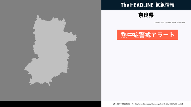 環境省と気象庁は、今日8月5日を対象とした熱中症警報アラートを奈良県に対して発表しました。外出はなるべく避け、室内をエアコン等で涼しい環境にして過ごしてください。