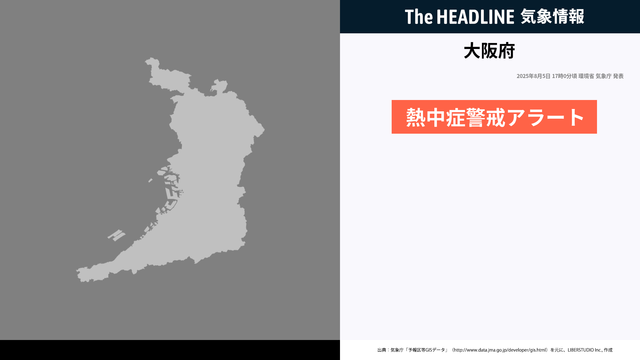 環境省と気象庁は、明日8月6日を対象とした熱中症警報アラートを大阪府に対して発表しました。外出はなるべく避け、室内をエアコン等で涼しい環境にして過ごしてください。