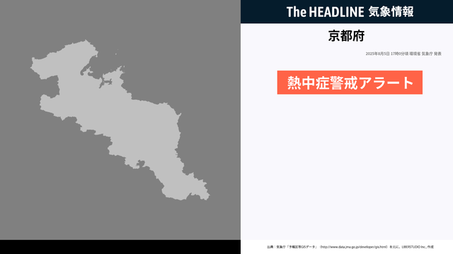 環境省と気象庁は、明日8月6日を対象とした熱中症警報アラートを京都府に対して発表しました。外出はなるべく避け、室内をエアコン等で涼しい環境にして過ごしてください。