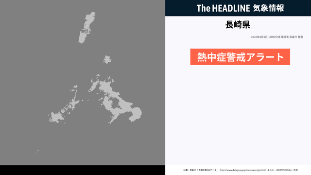 環境省と気象庁は、明日8月6日を対象とした熱中症警報アラートを長崎県に対して発表しました。外出はなるべく避け、室内をエアコン等で涼しい環境にして過ごしてください。