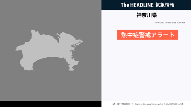 環境省と気象庁は、今日8月8日を対象とした熱中症警報アラートを神奈川県に対して発表しました。外出はなるべく避け、室内をエアコン等で涼しい環境にして過ごしてください。