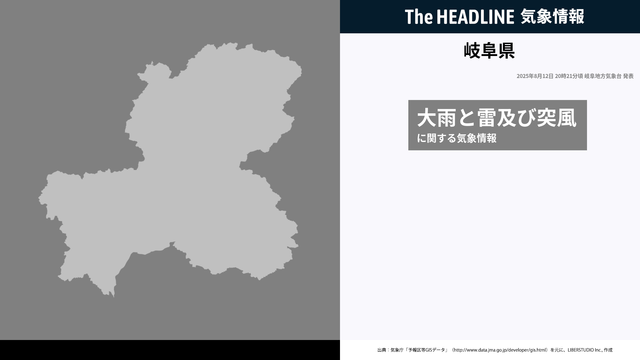 8月12日20時21分、岐阜地方気象台は、岐阜県に発表されている警報・注意報の経過、予測、防災上の留意点などを解説するために発表していた気象情報を更新した。